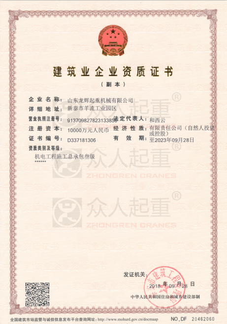 2019年12月27日,山東龍輝起重機(jī)械有限公司榮獲建筑施工安全生產(chǎn)許可證。建筑施工安全生產(chǎn)許可證是礦山企業(yè)、建筑施工企業(yè)和危險(xiǎn)化學(xué)品、煙花爆竹、民用生產(chǎn)企業(yè)必備的一個(gè)證件,它和企業(yè)資質(zhì)聯(lián)系在一塊,取得建筑施工資質(zhì)證書的企業(yè),必須申請(qǐng)安全生產(chǎn)許可證,方可進(jìn)行招投工作來(lái)接相應(yīng)工程,兩個(gè)證件是有機(jī)整體。